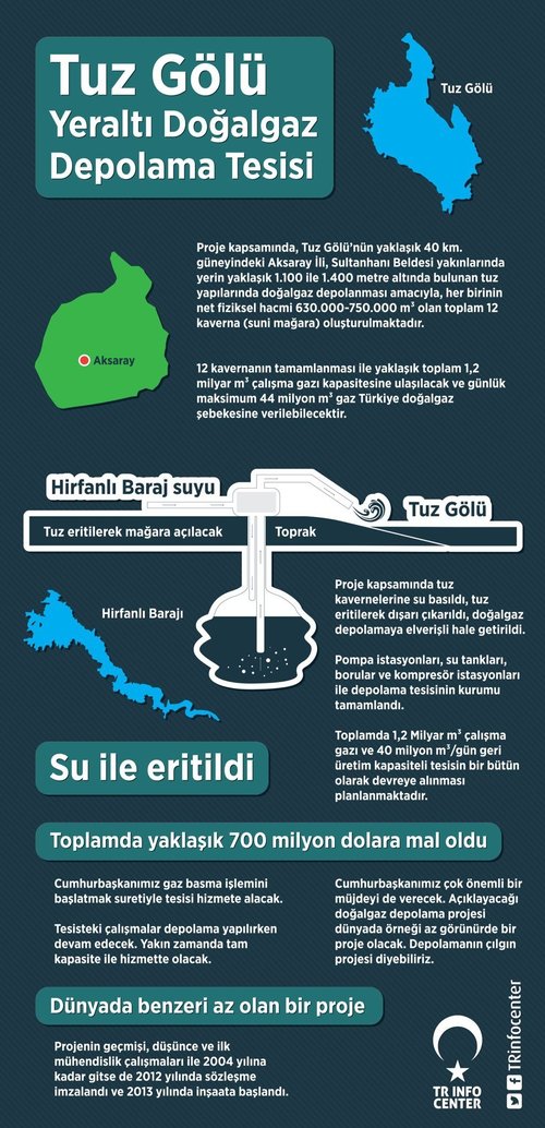 Cumhurbaşkanı Recep Tayyip Erdoğan, Aksaray'da Tuz Gölü Doğalgaz Depolama Tesisi ve yapımı tamamlanan kamu yatırımlarının toplu açılış töreninde konuştu. Toplam maliyeti 700 milyon doları bulan dev tesisin açılışında konuşan Cumhurbaşkanı Erdoğan, "Bu proje kapsamında Tuz Gölü'nün yüzeyinin 1400 metre altında doğalgaz depoları oluşturuldu. Her biri 630 bin ile 750 bin metreküp arasında kapasiteye sahip 12 suni mağaraya 1, 2 milyar metreküp doğalgaz depolanacak" dedi.