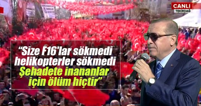 Tekirdağ'ın kahraman evlatları DEAŞ'lı, PKK'lı sürülere mekanlarını dar ediyor. 15 Temmuz gecesindeki demokrasi destanında Tekirdağlı yiğitlerin de kanı, canı, emeği var. Sizler göğsünüzü siper ettiniz. Size F-16'lar, tanklar, toplar, helikopterler sökmedi. Ben bu vatan için gözünü kırpmadan şehadete koşan tüm Tekirdağ'lı şehitlerimize Allah'tan rahmet diliyorum, yakınlarına sabırlar temenni ediyorum. Ayrıca gazilerimize de şifalar diliyorum.