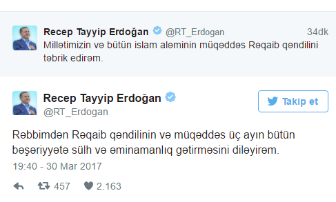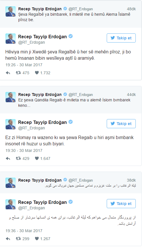 Erdoğan aynı paylaşımı Arapça, İngilizce, Kürtçe, Zazaca, Urduca, Farsça ve Azerbaycan Türkçesi'nde de yaptı.
