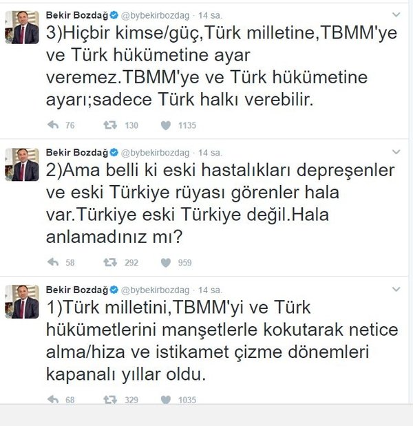 Bakan Bozdağ, sosyal medya hesabı Twitter üzerinden yaptığı açıklamada, "Türk milletini, TBMM'yi ve Türk hükümetlerini manşetlerle kokutarak netice alma, hiza ve istikamet çizme dönemleri kapanalı yıllar oldu. Ama belli ki eski hastalıkları depreşenler ve eski Türkiye rüyası görenler hala var. Türkiye eski Türkiye değil. Hala anlamadınız mı?" dedi.