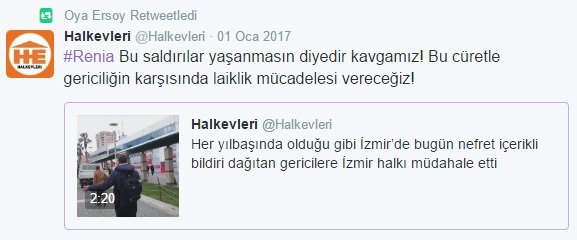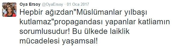 İstanbul Beşiktaş'taki Reina'da gerçekleşen hain terör saldırısı sonrasında Müslümanları hedef gösteren Halkevleri Genel Başkanı Oya Ersoy, "Hepbir ağızdan"Müslümanlar yılbaşı kutlamaz"propagandası yapanlar katliamın sorumlusudur! Bu ülkede laiklik mücadelesi yaşamsal!" diyerek toplumun sinir uçlarına yönelik çalışmalarına başladı. Hemen ardından Halkevleri örgütünün sosyal medya hesaplarında yoğun bir kara propaganda da eş zamanlı olarak başladı.