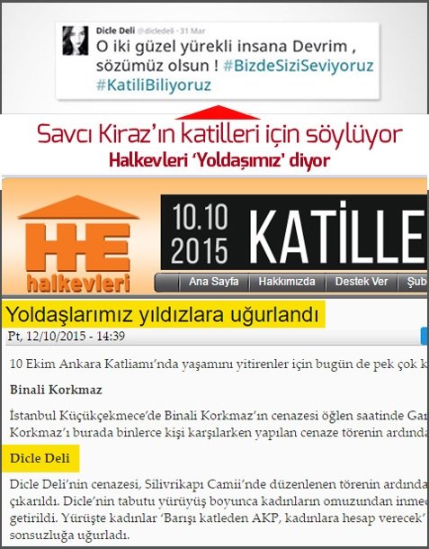 Terör örgütleri ve teröristlerle münasebeti bununla kalmayan Halkevleri yine resmi sitesindeki çapraz ilişkilerle Savcı Selim Kiraz'ı makamında şehid eden 2 DHKP-C'li terörist ile yoldaş olduğunu ifade ediyor. Savcı Kiraz'ı şehid eden teröristlerin saldırısını öven Dicle Deli Ankara'da bir terör saldırısında öldü. Teröristleri öven ve sevgi cümleleriyle onlarla vedalaşan Dicle Deli'nin ölümü sonrasında ise bu kez Halkevleri Deli'yi "Yoldaşımız" diyerek uğurladı.