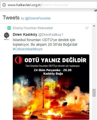 Halkevleti örgütünün web sitesinde de "direniş forumları" adı altında oluşturulan sayfada ziyaretçilere takip etmeleri için oluşturulan sosyal medya profillerinin paylaşımları yayınlanıyor. Gezi'deki şiddetle ile ilgili çok sayıda paylaşım bulunan Halkevleri direniş sayfasında ODTÜ için de tüm Türkiye'de eylem çağrısı yapılıyor. Bu eylem çağrılarının terör örgütlerinin yöntemlerini işaret eden, sokakların ateşe verildiği fotoğraflarla yapılması dikkat çekiyor.