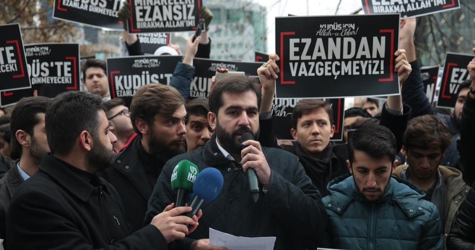 İstanbul polisinin geniş güvenlik önlemleri aldığı eylemde, Filistin bayrakları taşıyan ve İsrail aleyhtarı pankart ve dövizler açan kalabalık, 'Minareleri ezansız bırakma Allah'ım', 'Kudüs'te ezan susmaz' şeklinde sloganlar attı.
